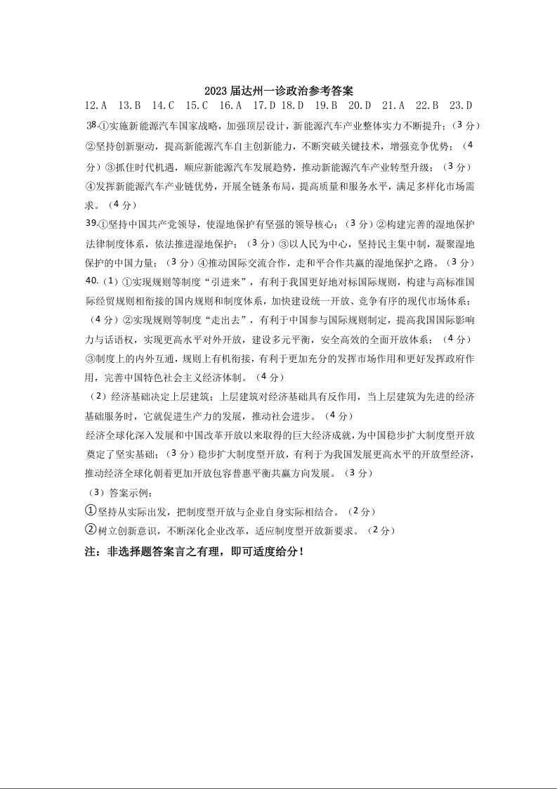 高三文综政治答案--四川省达州市普通高中2023届高三第一次诊断性测试