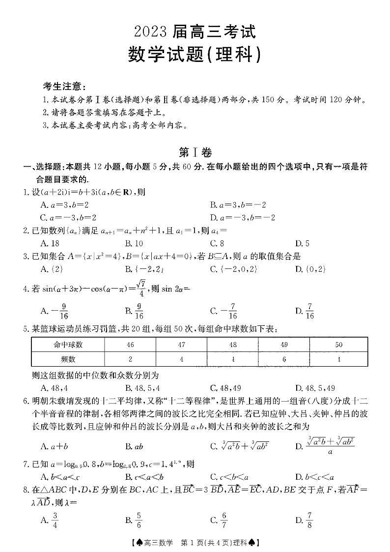 高三理数--四川省部分学校2023届高三上学期12月大联考