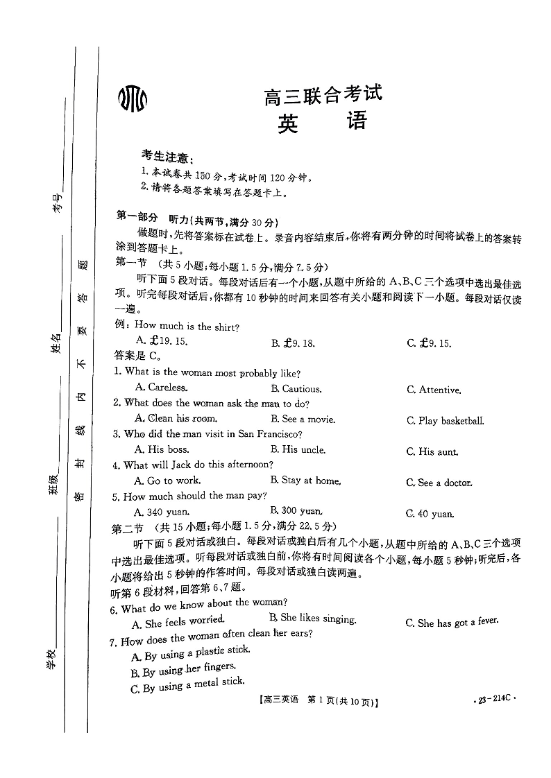 高三英语+答案--贵州省毕节市部分学校2023届高三12月联合考试