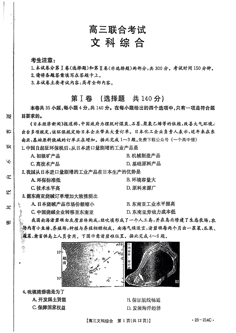 高三文综--贵州省毕节市部分学校2023届高三12月联合考试