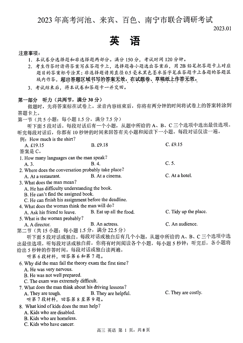 高三英语--广西桂林、崇左市2023年高考联合一模调研考试