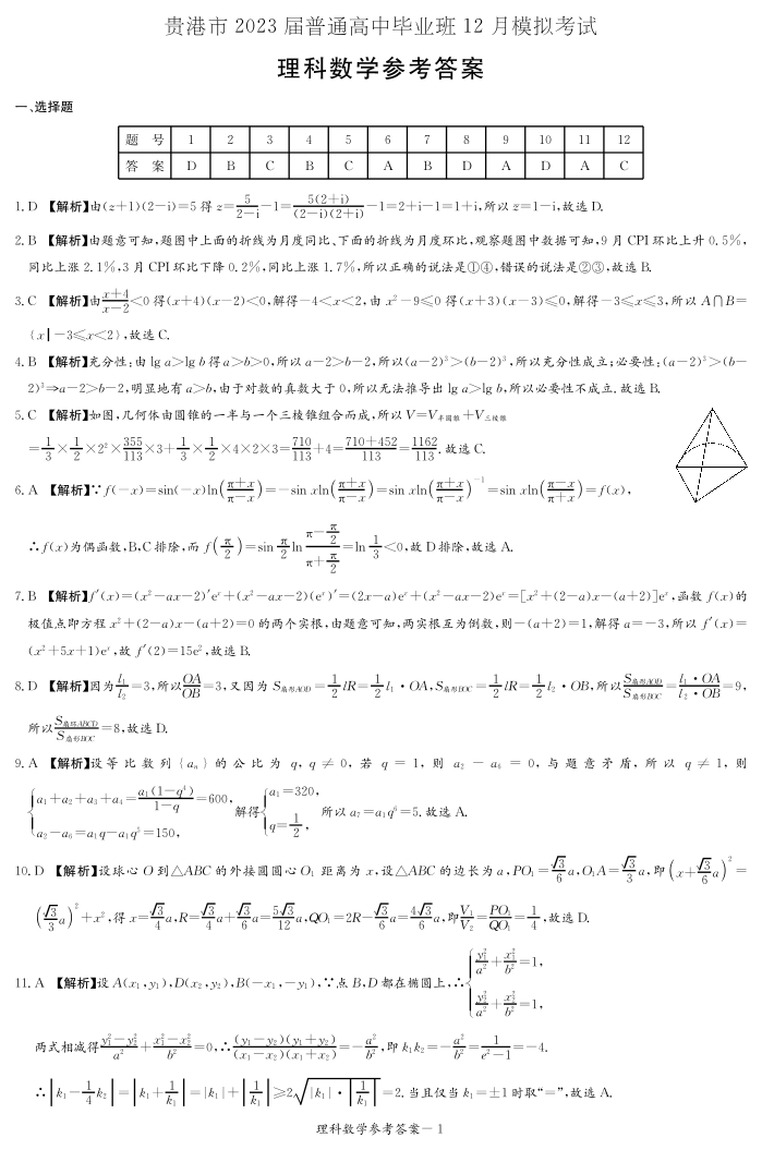 高三理数答案--广西贵港市2022-2023学年普通高中毕业班12月模拟考试