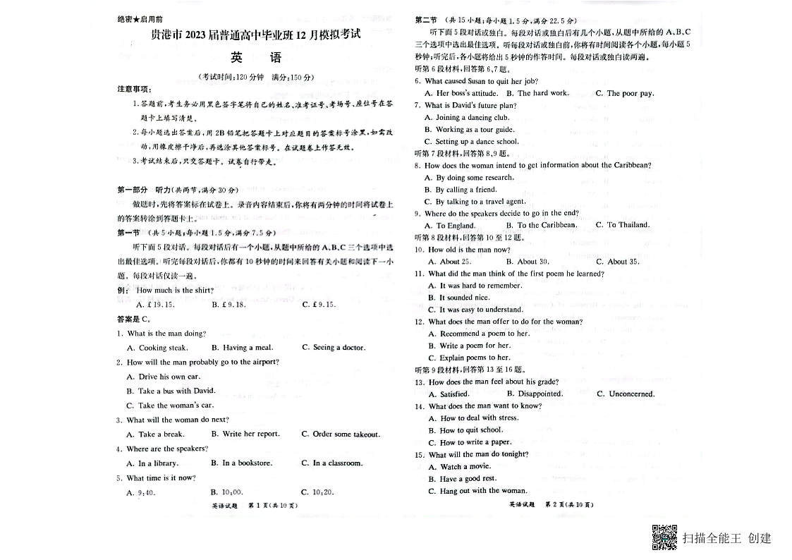 高三英语--广西贵港市2022-2023学年普通高中毕业班12月模拟考试