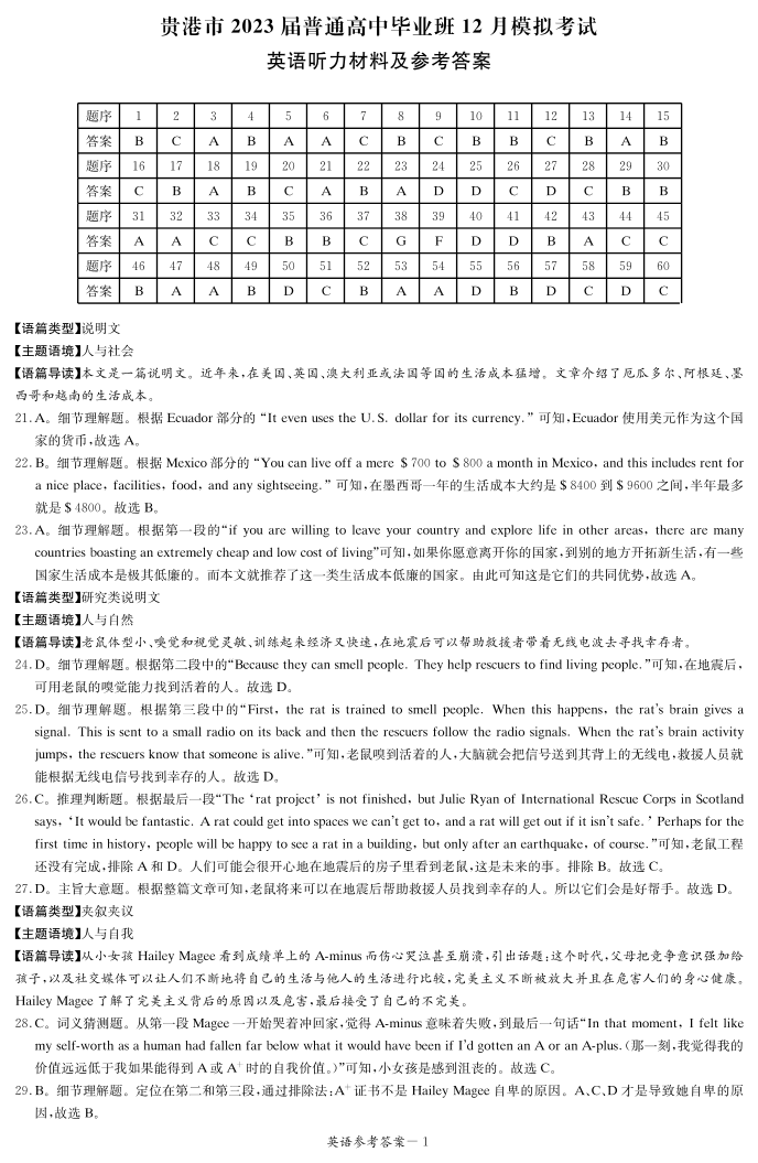 高三英语答案--广西贵港市2022-2023学年普通高中毕业班12月模拟考试