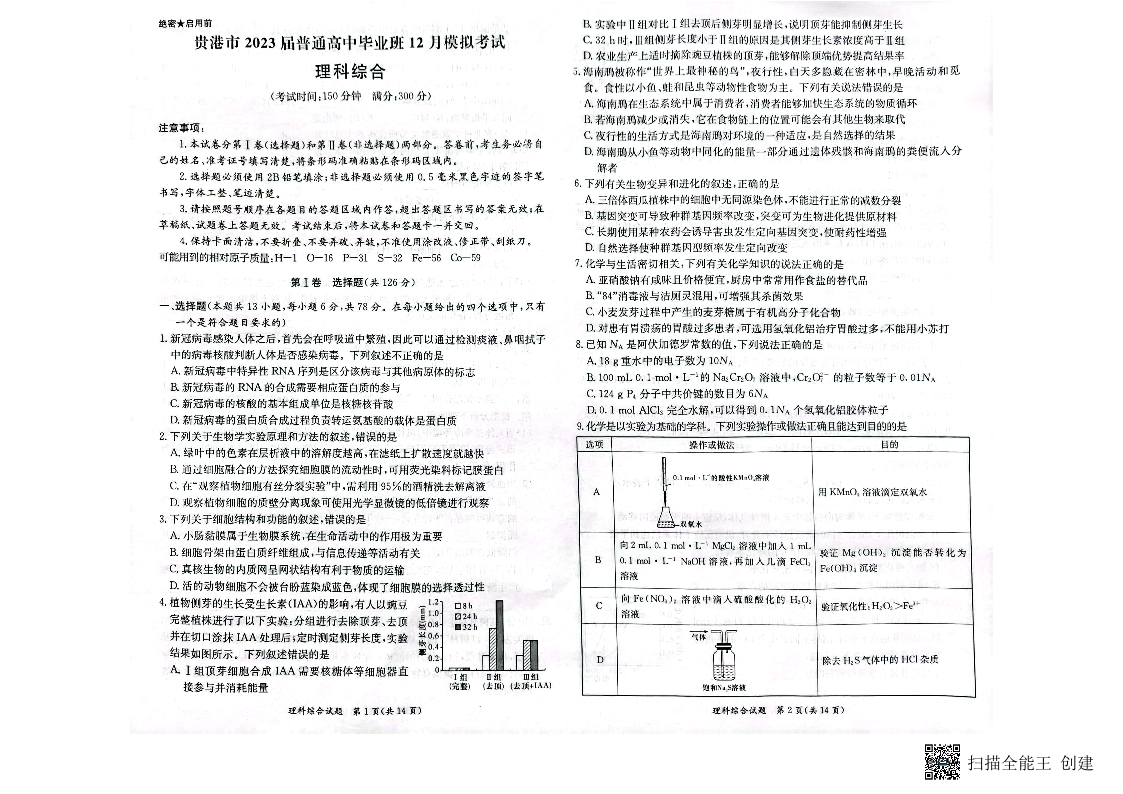 高三理综--广西贵港市2022-2023学年普通高中毕业班12月模拟考试