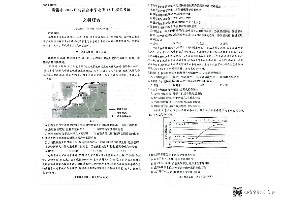 高三文综--广西贵港市2022-2023学年普通高中毕业班12月模拟考试