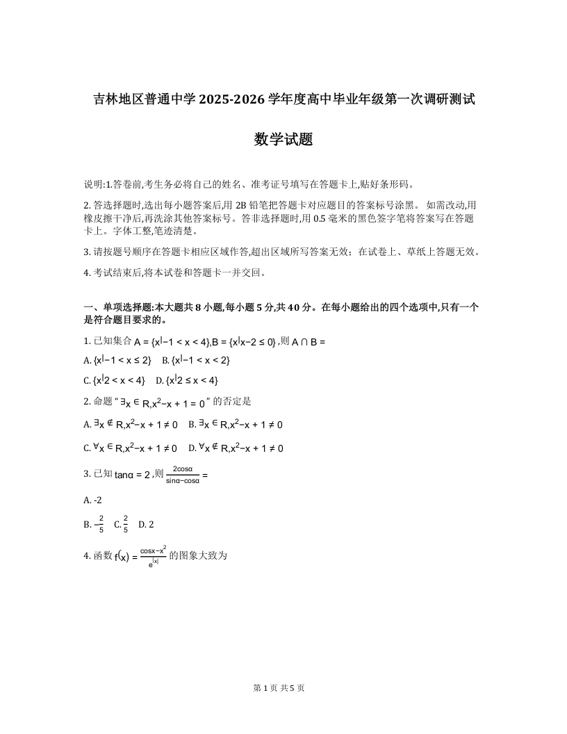 高三数学--吉林省吉林市普通中学2026届高三上学期10月第一次调研测试
