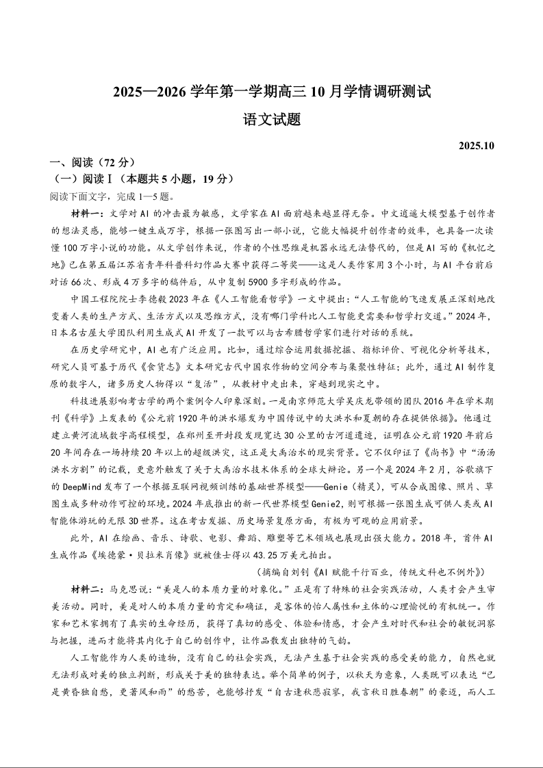 高三语文+答案--江苏省扬州市高邮市2026届高三上学期10月学情调研测试