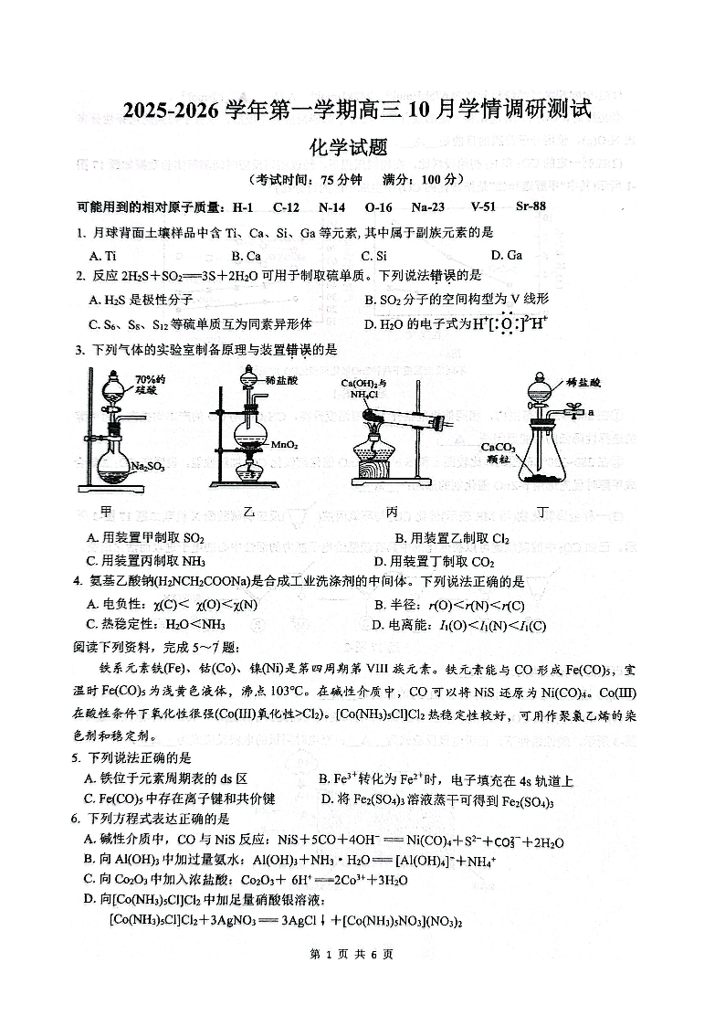高三化学+答案--江苏省扬州市高邮市2026届高三上学期10月学情调研测试