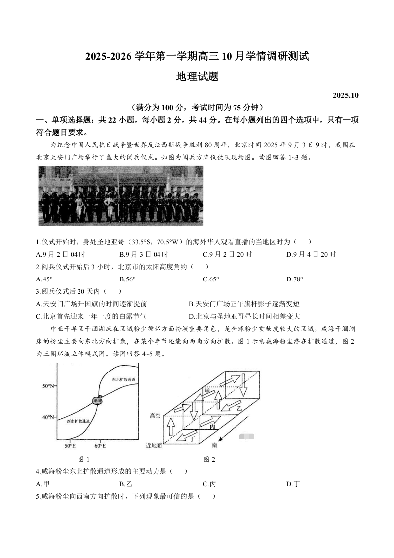 高三地理+答案--江苏省扬州市高邮市2026届高三上学期10月学情调研测试