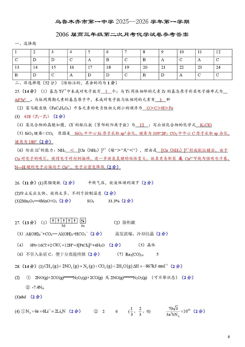 高三化学答案--新疆乌鲁木齐市第一中学2026届高三年级第二次月考