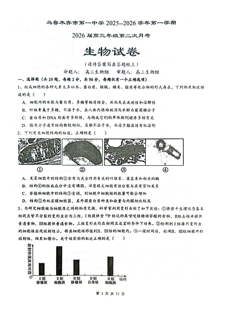 高三生物--新疆乌鲁木齐市第一中学2026届高三年级第二次月考