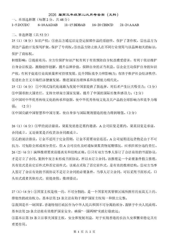 高三政治答案--新疆乌鲁木齐市第一中学2026届高三年级第二次月考