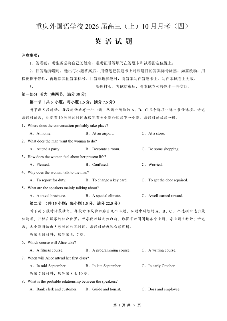 高三英语--重庆实验外国语学校2026届高三10月月考(四)