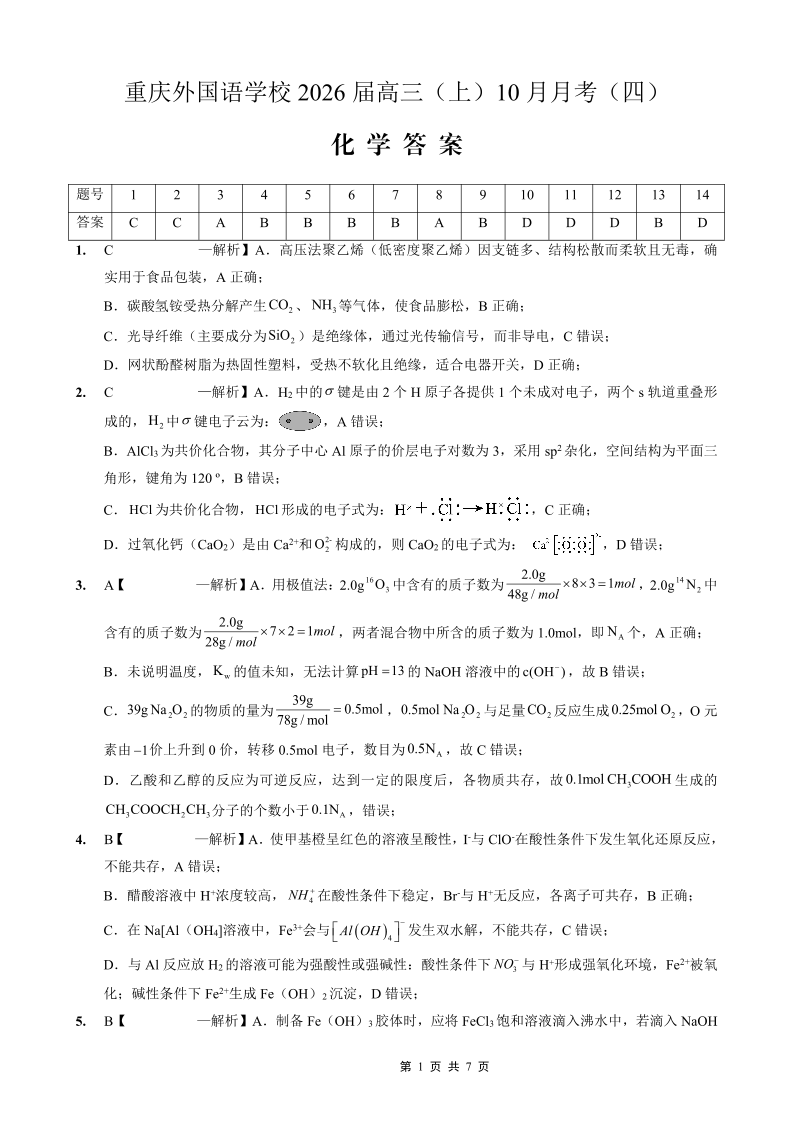 高三化学答案--重庆实验外国语学校2026届高三10月月考(四)