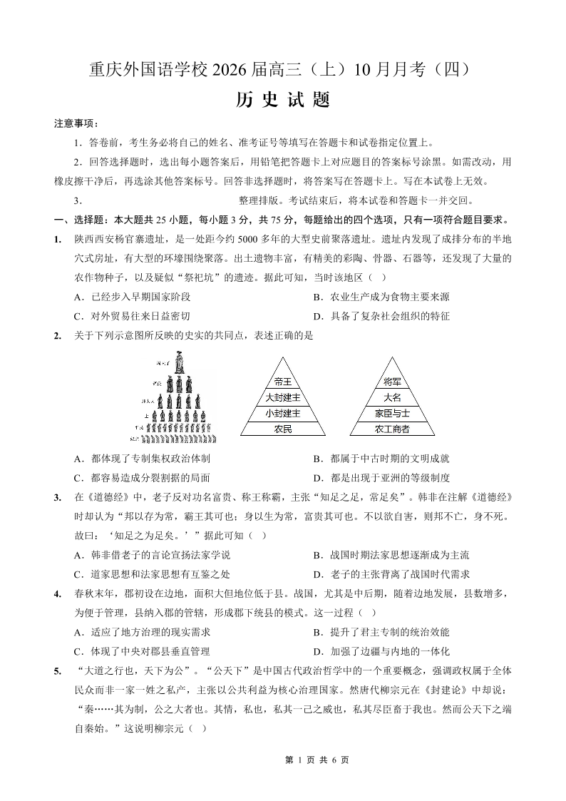 高三历史--重庆实验外国语学校2026届高三10月月考(四)