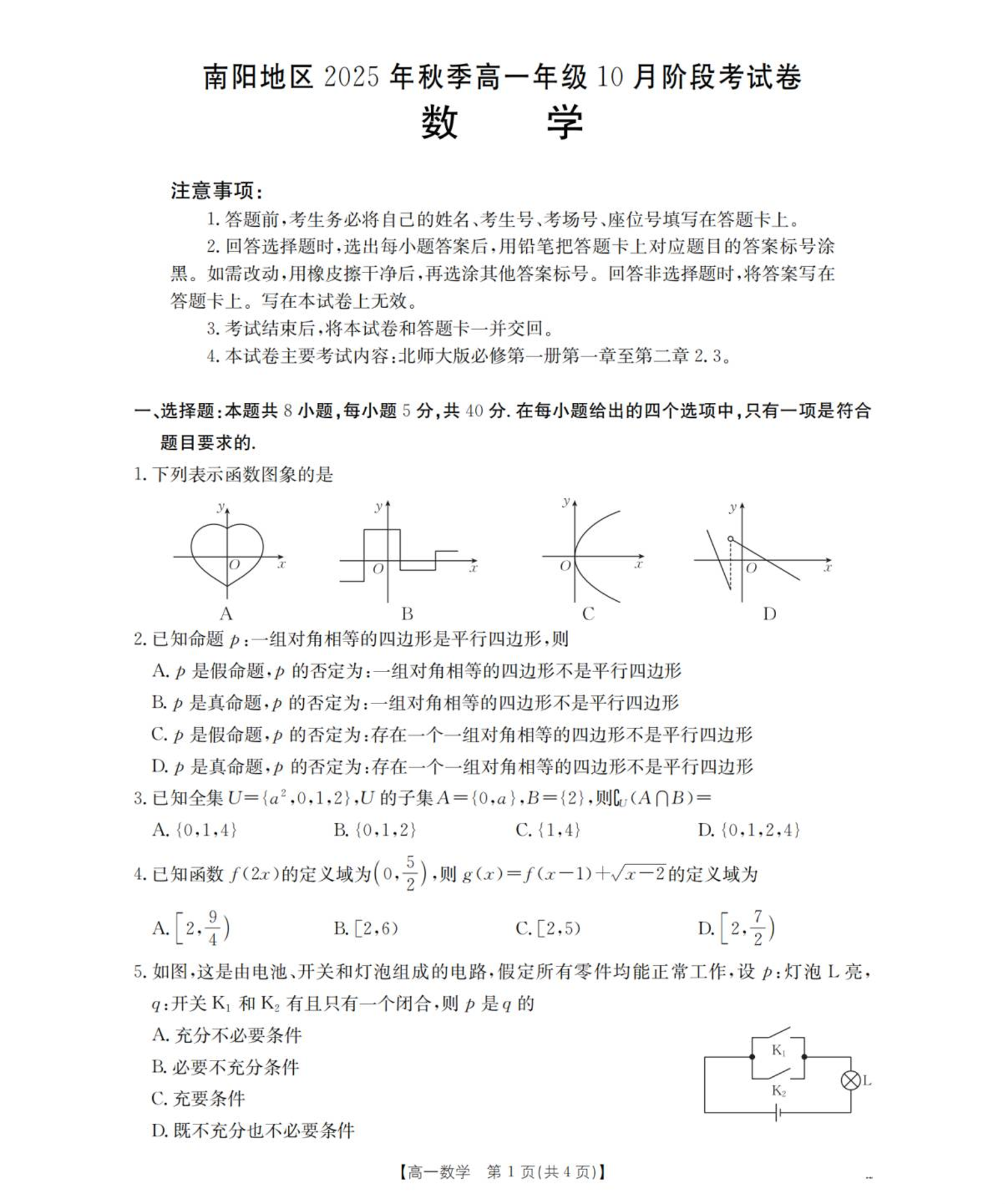 高一数学--河南省南阳地区2025年秋季高一10月阶段考试卷