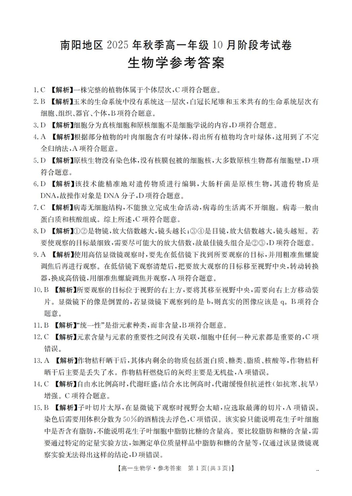 高一生物答案--河南省南阳地区2025年秋季高一10月阶段考试卷