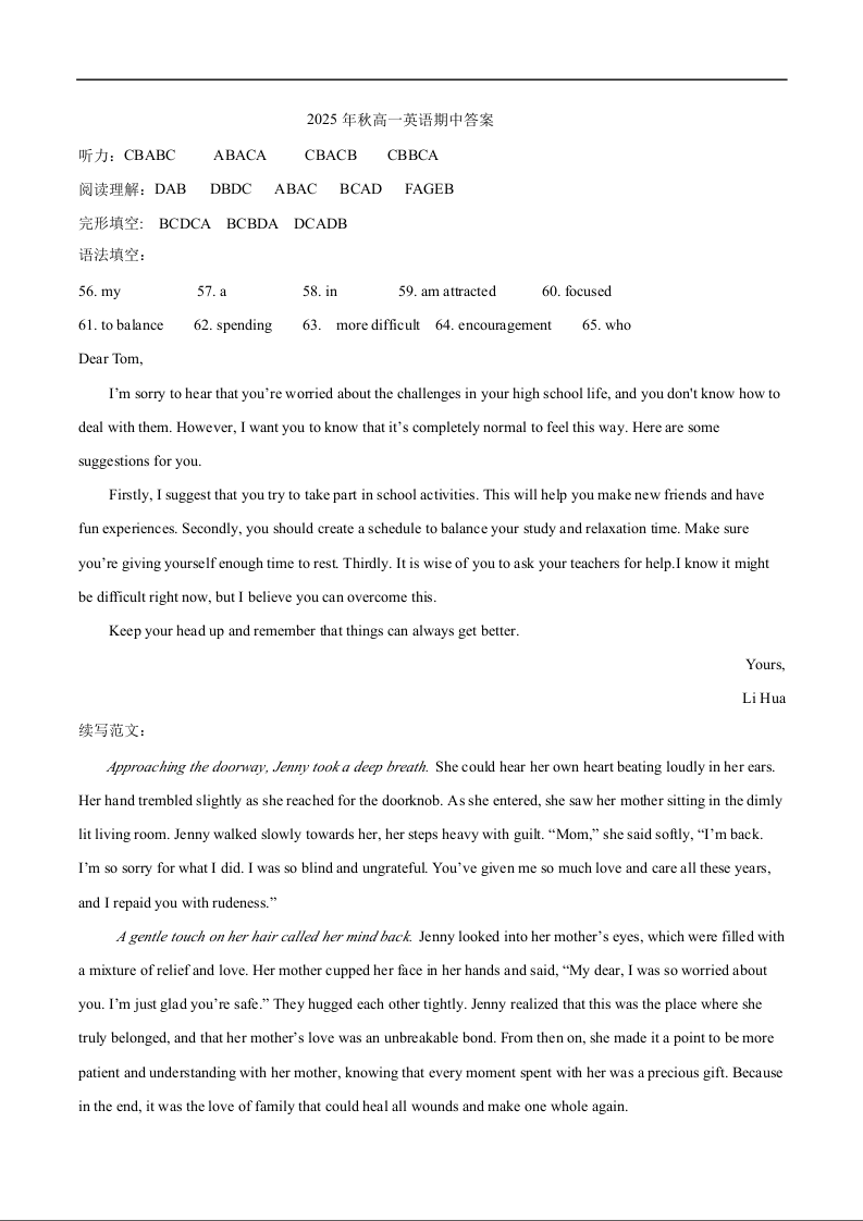 高一英语答案--湖北省黄冈市黄梅县育才高级中学2025-2026学年高一上学期10月期中考试