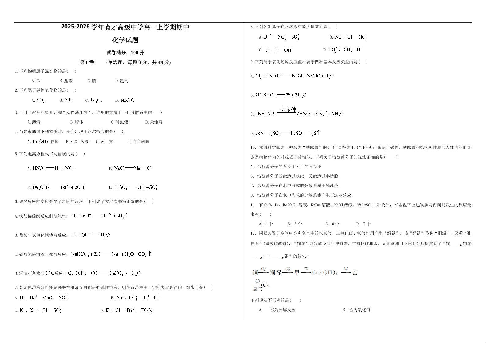 高一化学--湖北省黄冈市黄梅县育才高级中学2025-2026学年高一上学期10月期中考试