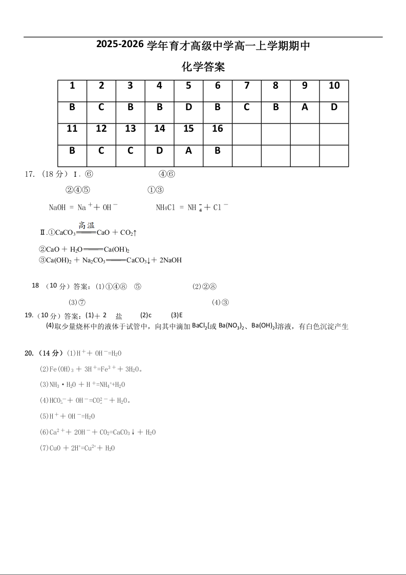 高一化学答案--湖北省黄冈市黄梅县育才高级中学2025-2026学年高一上学期10月期中考试