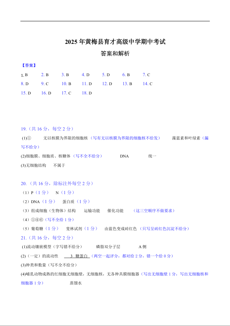 高一生物答案--湖北省黄冈市黄梅县育才高级中学2025-2026学年高一上学期10月期中考试