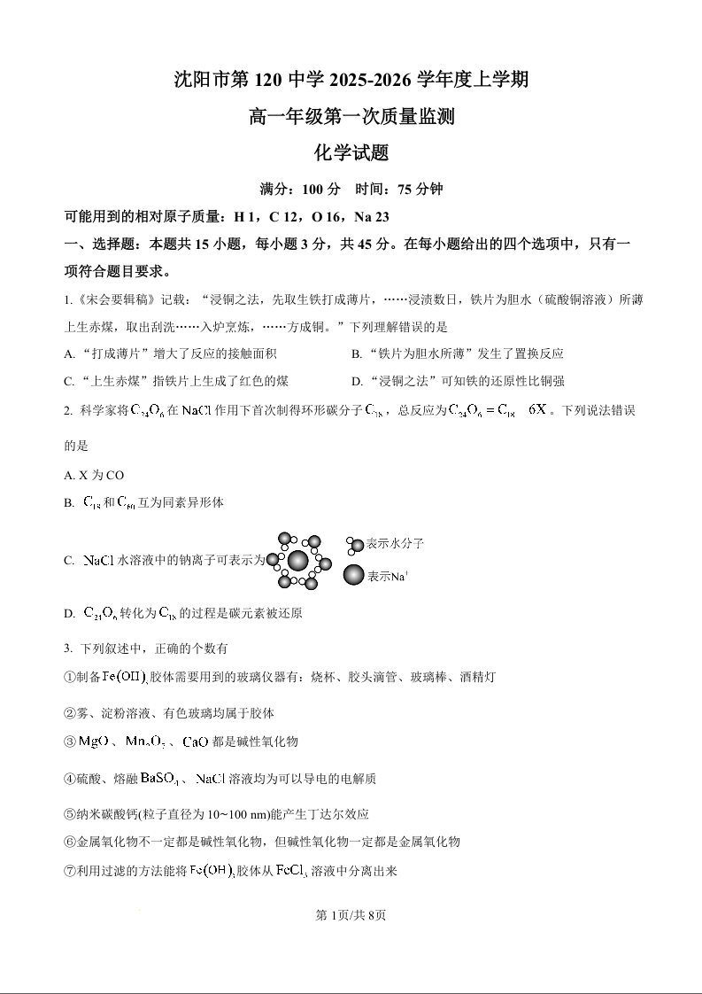 高一化学(原卷版)--辽宁省沈阳市第一二〇中学2025-2026学年高一上学期第一次质量检测