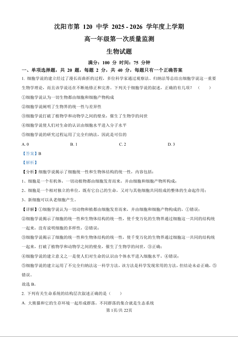 高一生物(精品解析版)--辽宁省沈阳市第一二〇中学2025-2026学年高一上学期第一次质量检测
