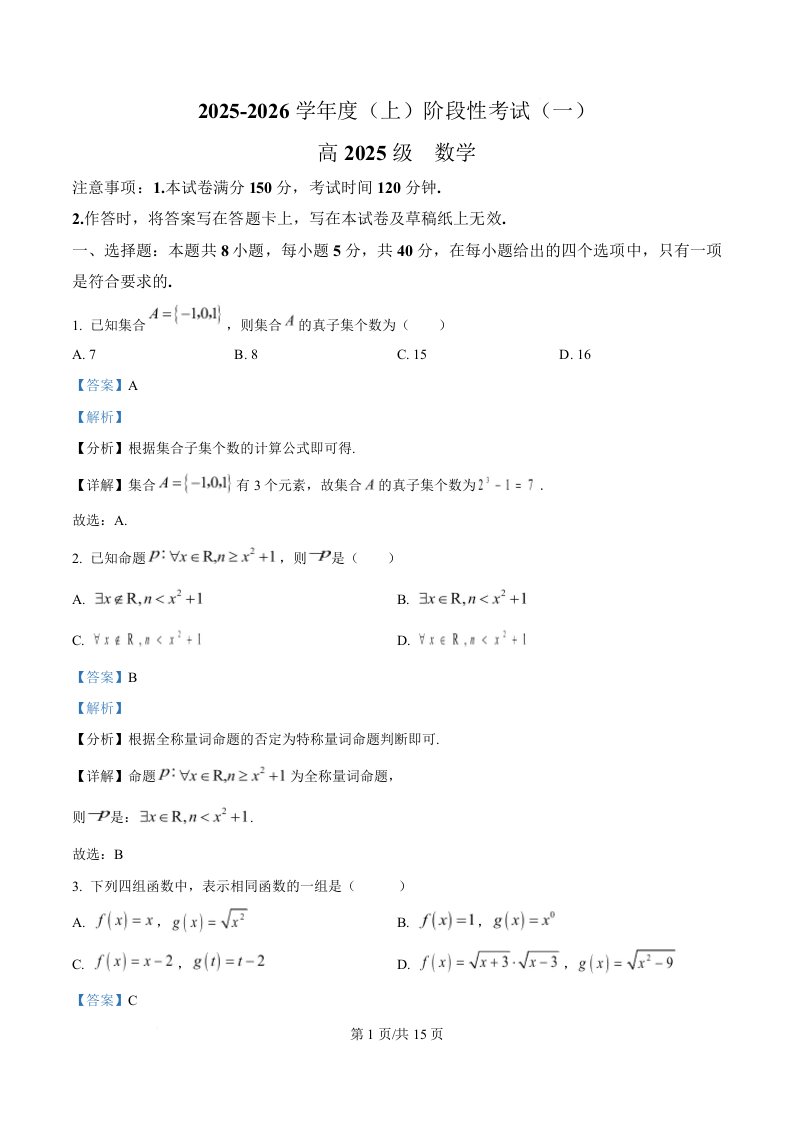 高一数学(解析版)--四川省成都市列五中学2025-2026学年高一上学期阶段性考试(一)