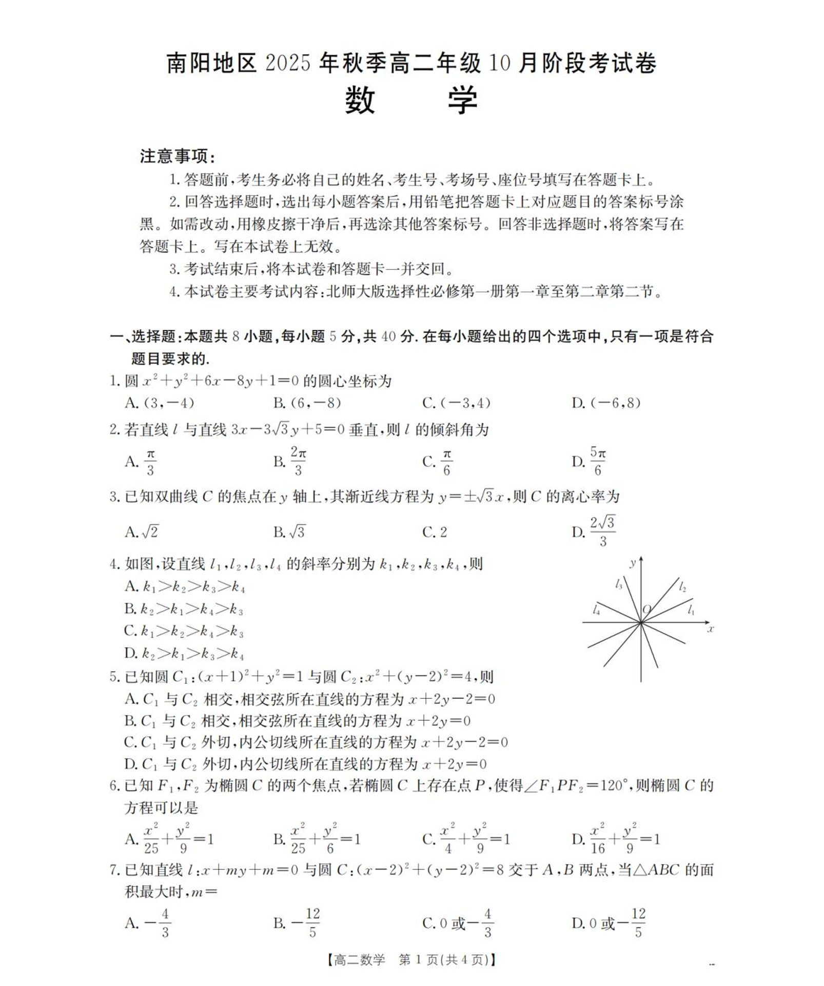 高二数学--河南省南阳地区2025年秋季高二10月阶段考试卷