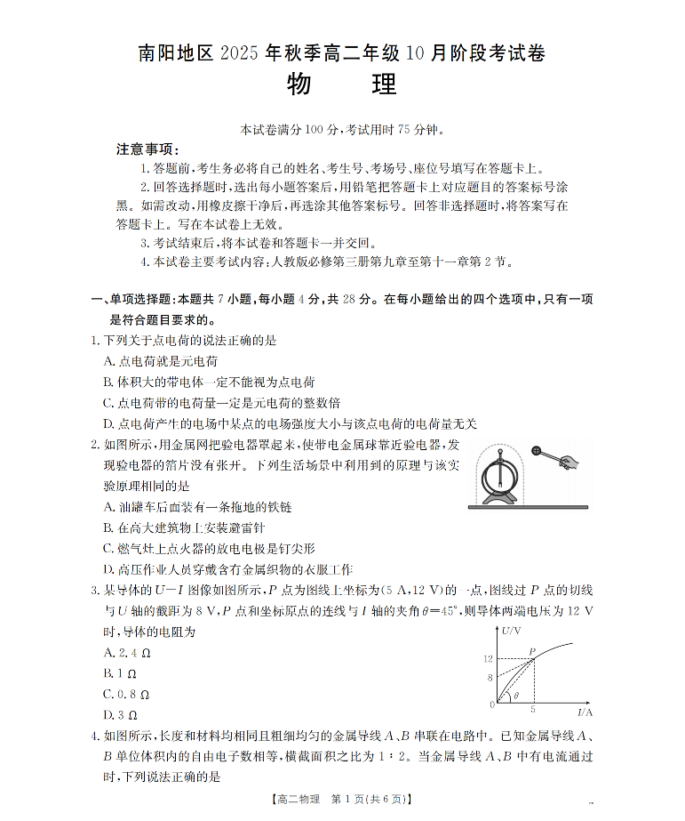 高二物理--河南省南阳地区2025年秋季高二10月阶段考试卷
