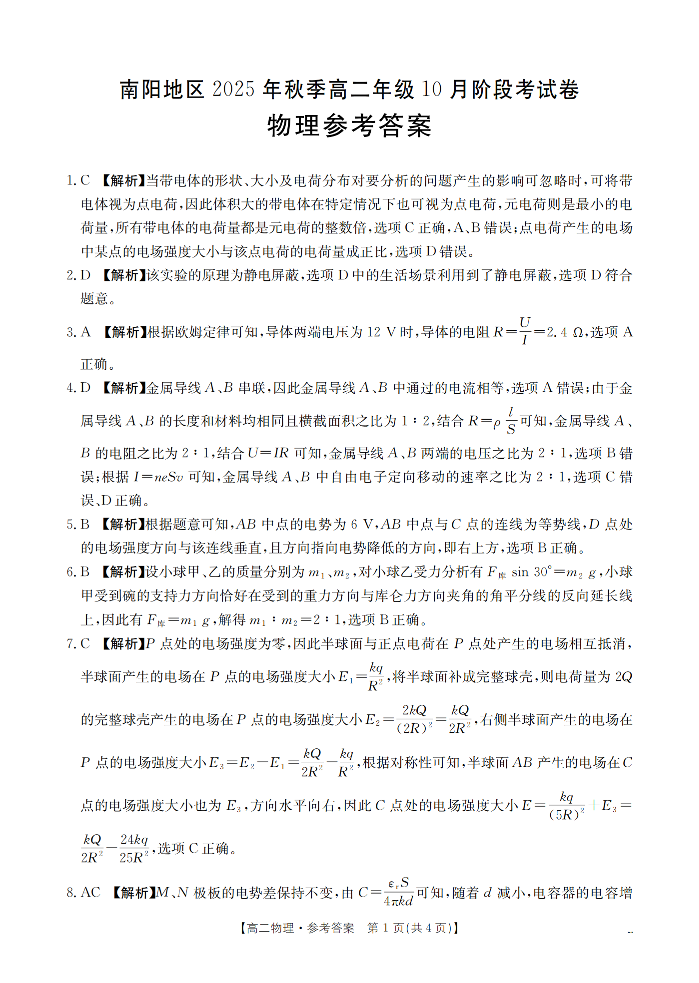 高二物理答案--河南省南阳地区2025年秋季高二10月阶段考试卷