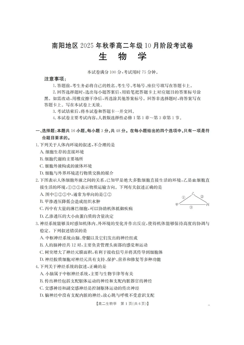 高二生物+答案--河南省南阳地区2025年秋季高二10月阶段考试卷
