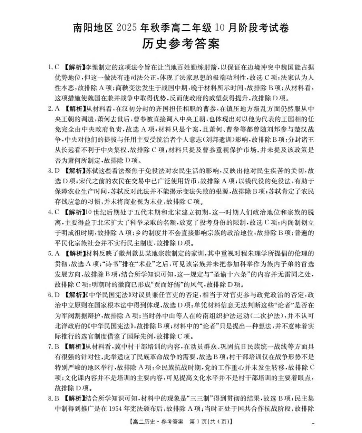 高二历史答案--河南省南阳地区2025年秋季高二10月阶段考试卷