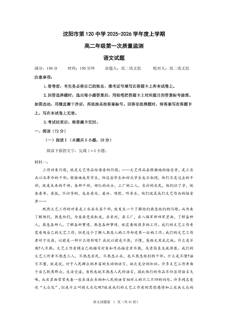 高二语文--辽宁省沈阳市第一二〇中学2025-2026学年高二上学期第一次质量检测