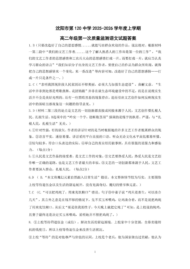 高二语文答案--辽宁省沈阳市第一二〇中学2025-2026学年高二上学期第一次质量检测