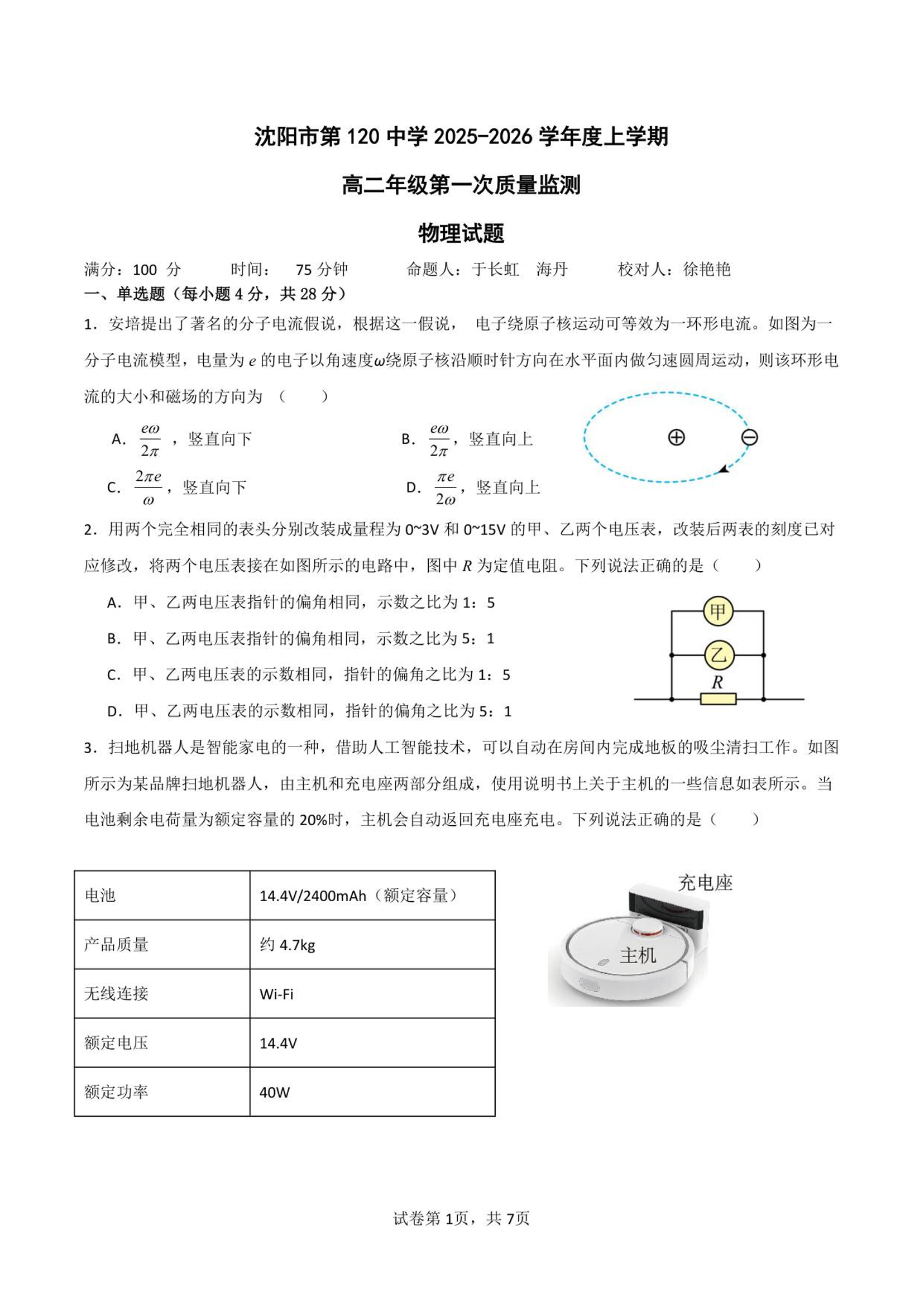 高二物理--辽宁省沈阳市第一二〇中学2025-2026学年高二上学期第一次质量检测