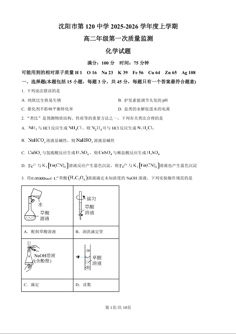 高二化学(原卷版)--辽宁省沈阳市第一二〇中学2025-2026学年高二上学期第一次质量检测