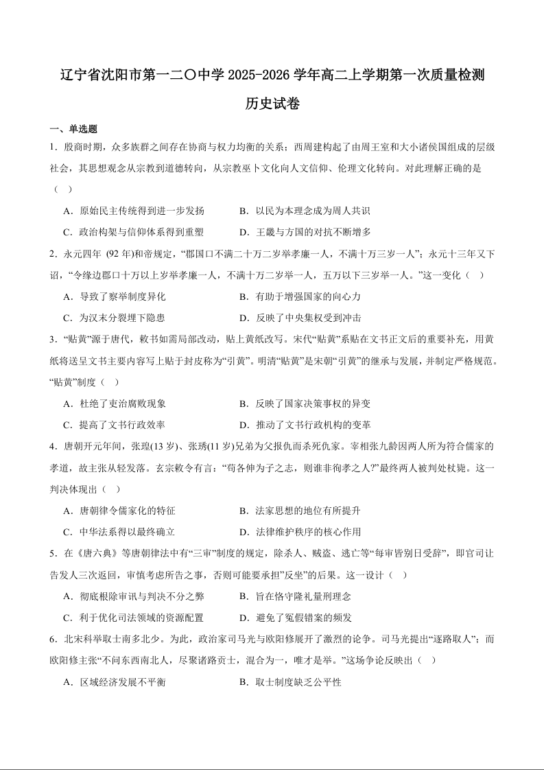 高二历史+答案--辽宁省沈阳市第一二〇中学2025-2026学年高二上学期第一次质量检测