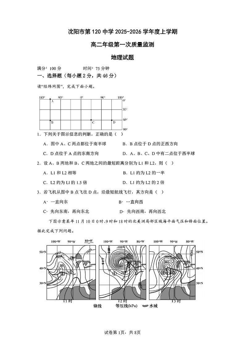 高二地理+答案--辽宁省沈阳市第一二〇中学2025-2026学年高二上学期第一次质量检测