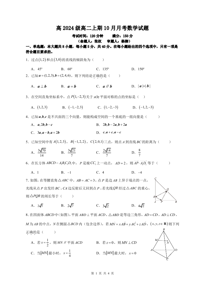 高二数学--重庆市万州二中2025-2026学年高二上学期10月月考试题