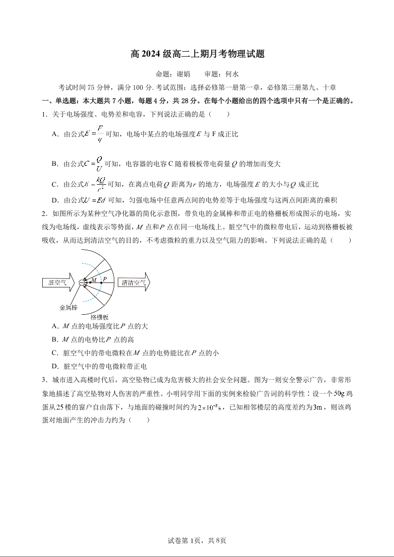 高二物理--重庆市万州二中2025-2026学年高二上学期10月月考试题