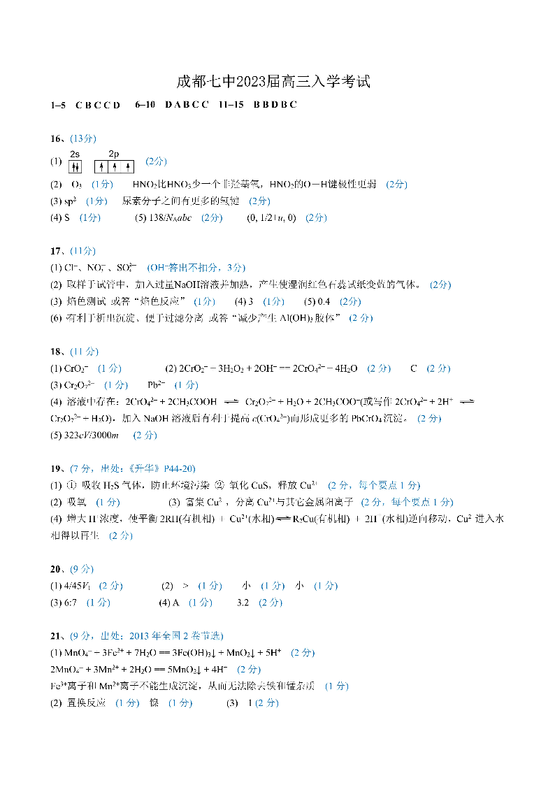 高三化学答案--四川省成都市第七中学2023高三上学期入学考试