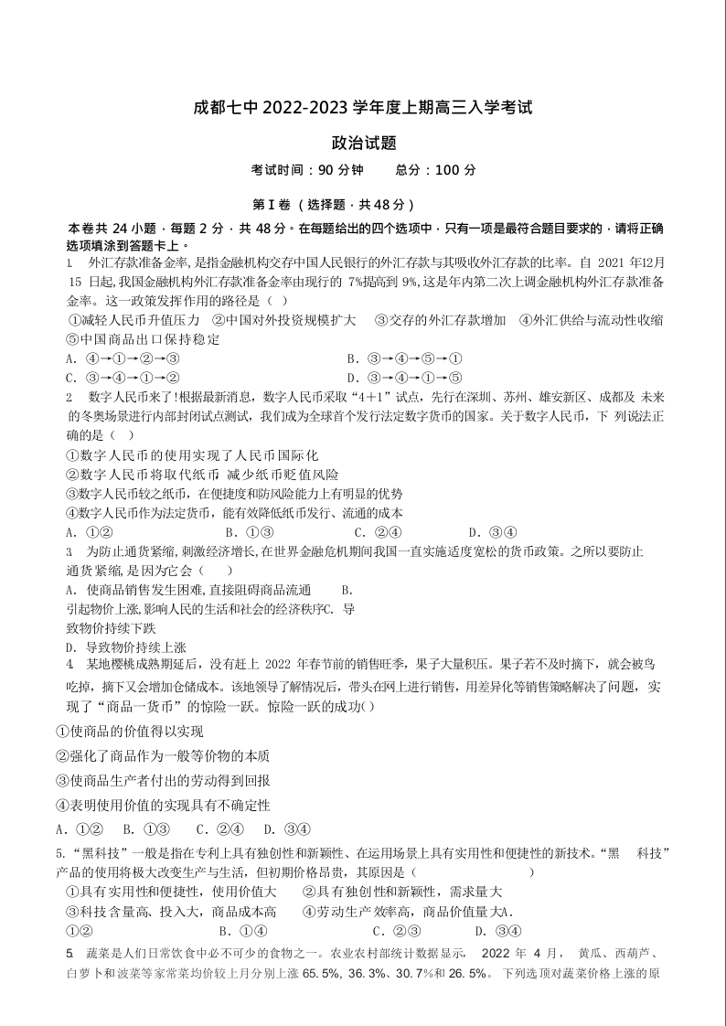 高三政治--四川省成都市第七中学2023高三上学期入学考试