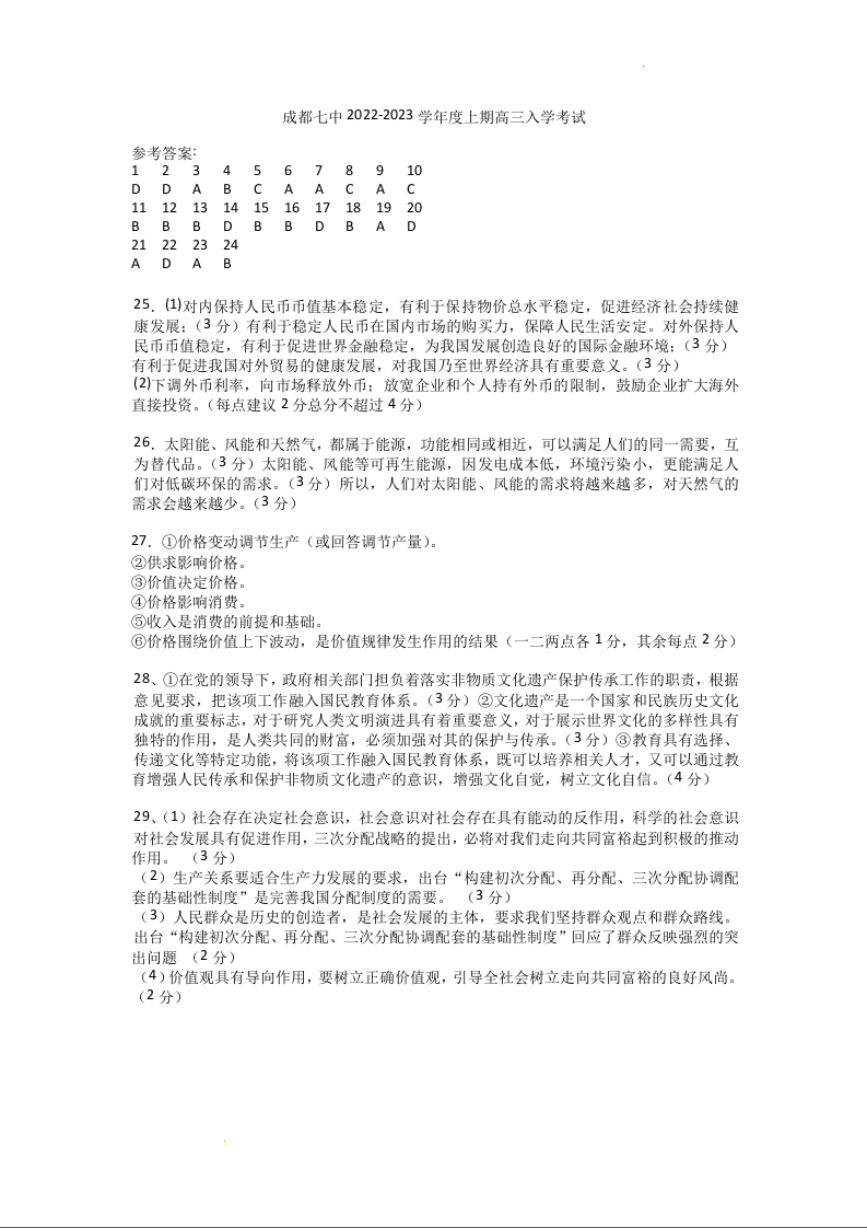 高三政治答案--四川省成都市第七中学2023高三上学期入学考试