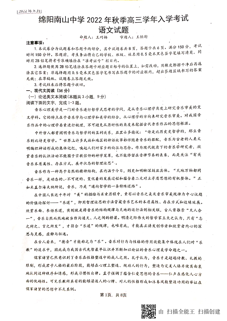 高三语文+答案--四川省绵阳南山中学2023高三上学期入学考试