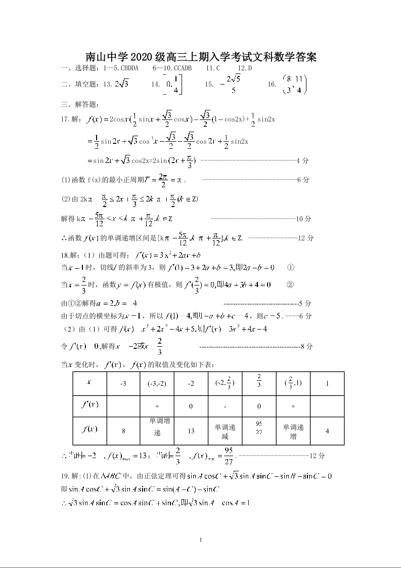 高三文科数学答案--四川省绵阳南山中学2023高三上学期入学考试
