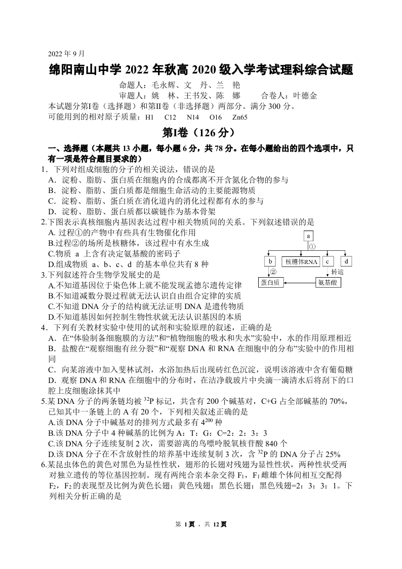 高三理综--四川省绵阳南山中学2023高三上学期入学考试