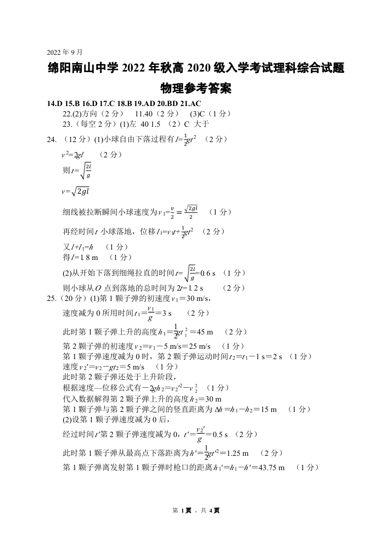 高三理综答案--四川省绵阳南山中学2023高三上学期入学考试