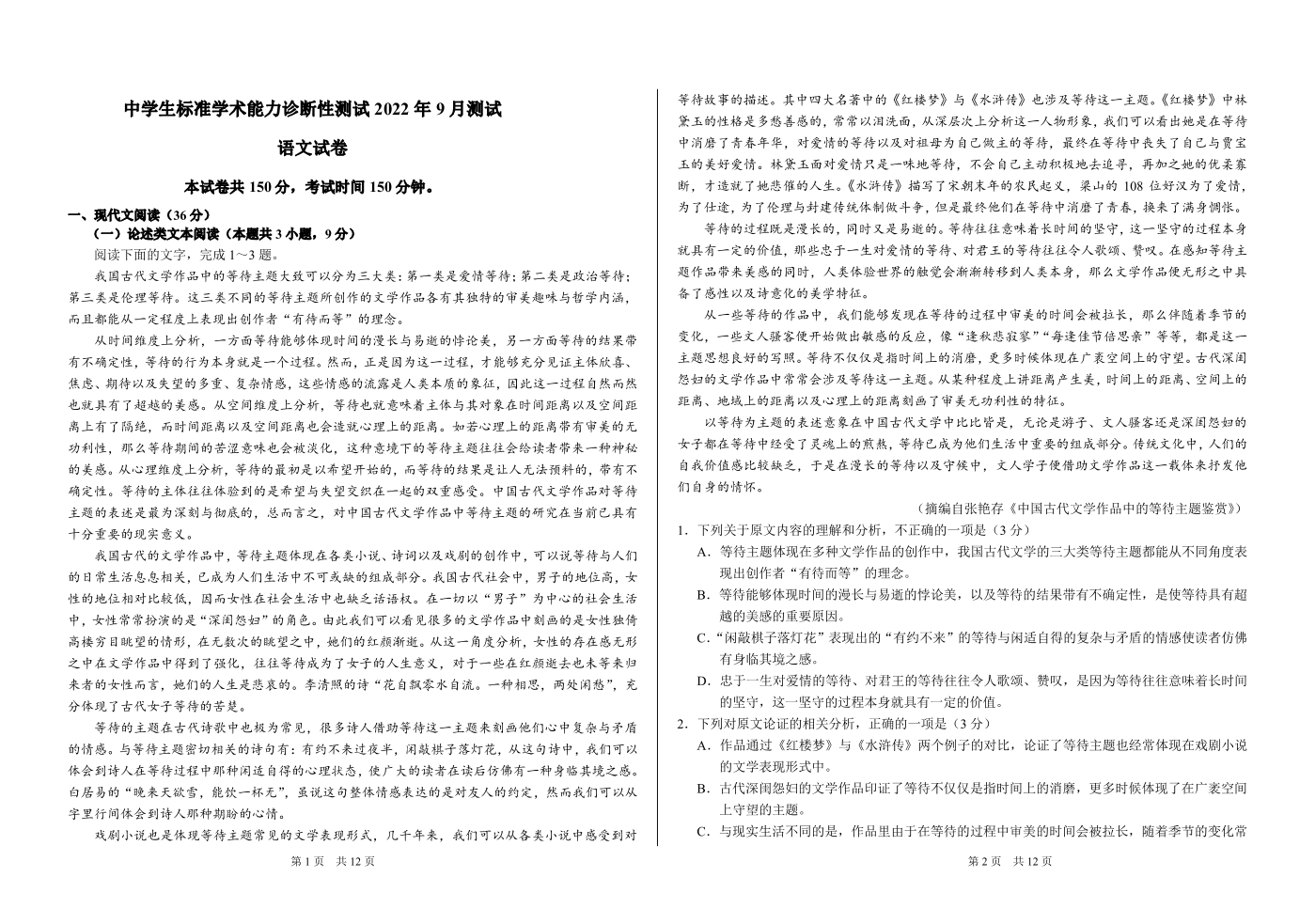 高三语文----2022年9月中学生标准学术能力诊断性测试测试